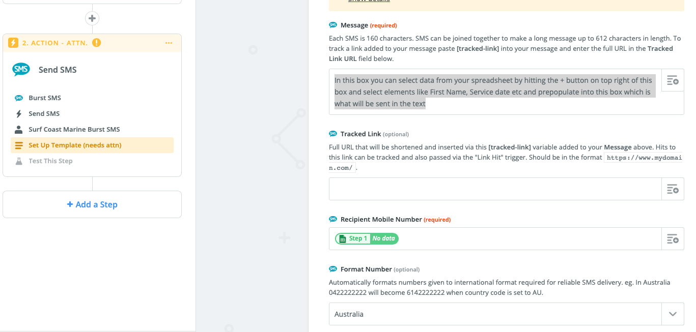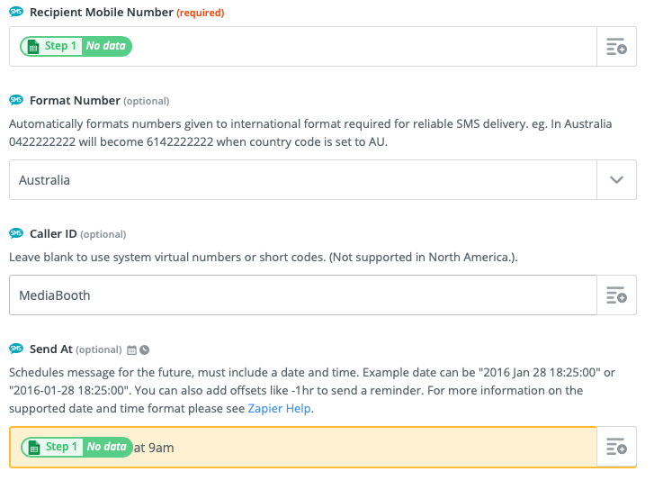 Step 9: In the final parts of the configuration you will need to select Format number in this case we are sending from Australia this allows the SMS provider to add the country code to the number to ensure delivery. Next is caller ID, with this you can purchase/rent your ownunique mobile number from Burst SMS or use a word as the number like MediaBooth, the word must be 11 characters or less to function properly. Finally, we select Send At this is the date from the spreadsheet titled Next Service Due but we also want to add at 9am next to this date to ensure customers don’t receive the text message at midnight when the date comes into play. Zapier can distinguish human-readable terms like tomorrow at 9am or today at midday, note for this you must have your timezone set correctly in your Zapier profile i.e. AEST time zone.
