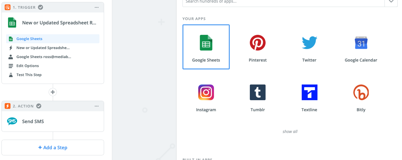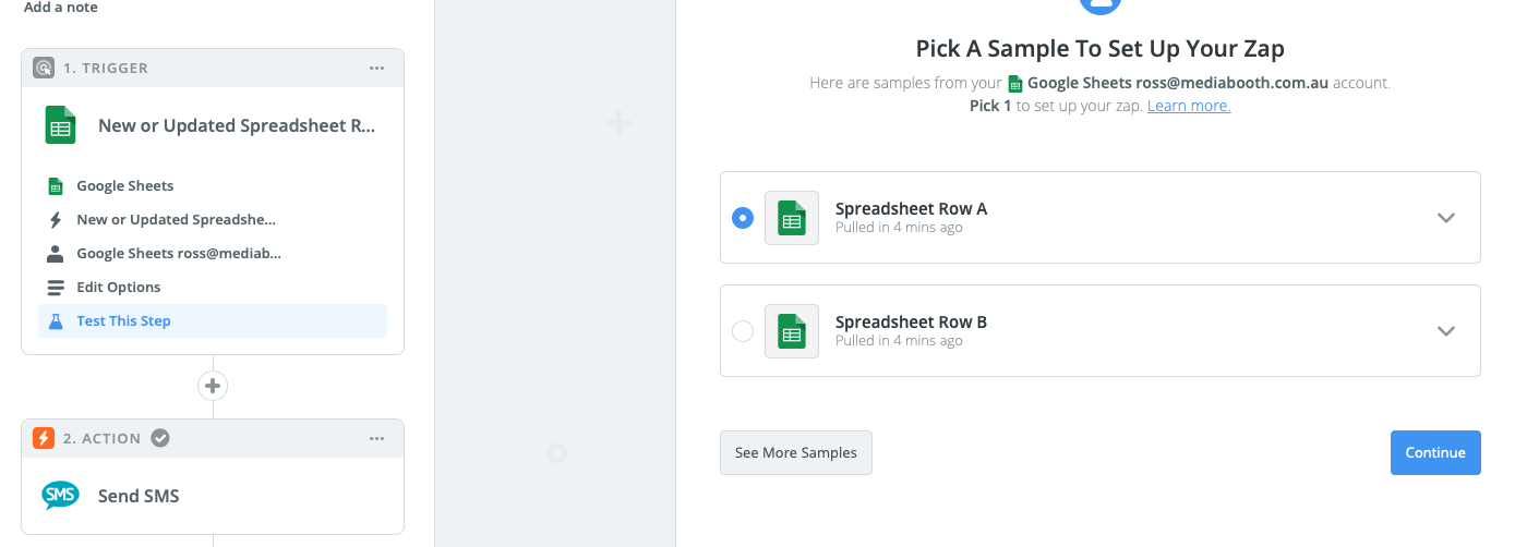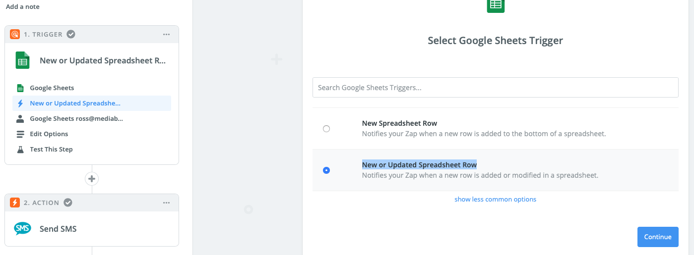 Step 3: In the next step, once you’ve connected your account, you want to select New or Updated Spreadsheet Row as the second part of your trigger, see below screenshot.