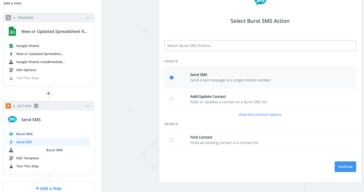 Step 7: Our action for Burst SMS is to “Send SMS” as pictured below, select Send SMS and click continue.