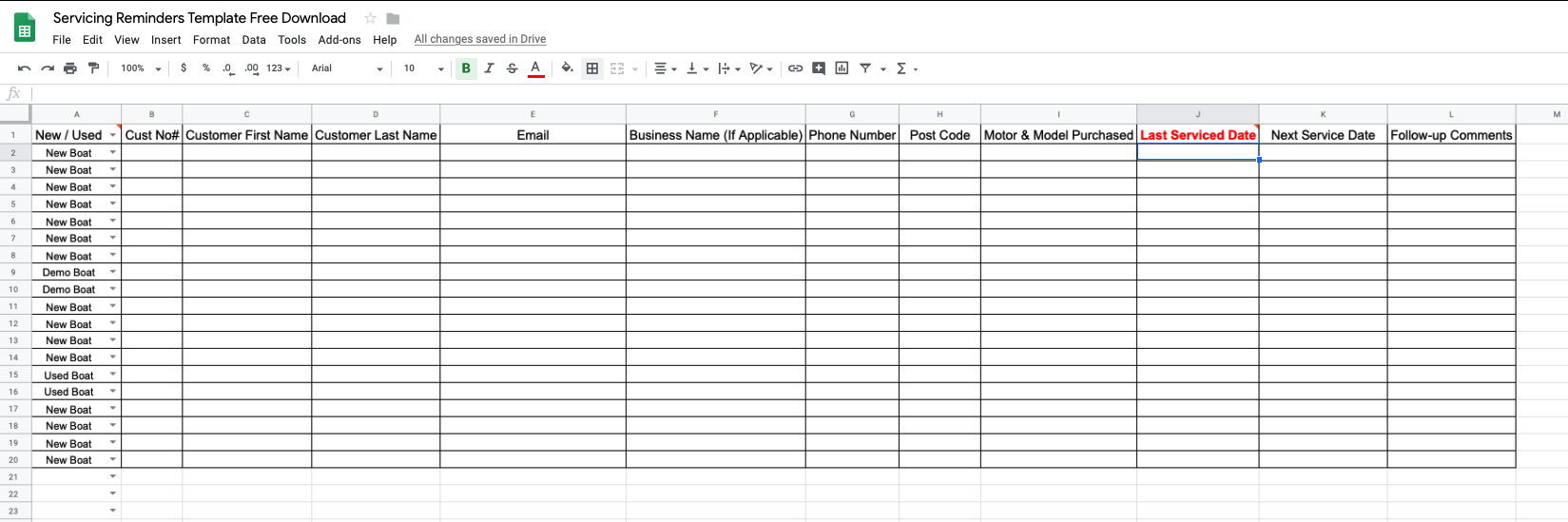 In the spreadsheet above we do have some formatting like when you double click in the Last Serviced Date column it will bring up a date picker, also the Next Service Date column uses a formula to add 335 days to the last date, now this has been stripped out of the template so that you can set your own timeframe. To add the formula simply click row K line 2 and paste the following formula = J2 + 335 (J2 will be the column/row with the original date and the + 335 is 335 days added onto the date from the J column. To add this formula to the whole column grab the bottom right-hand corner of the blue box and drag down the column.