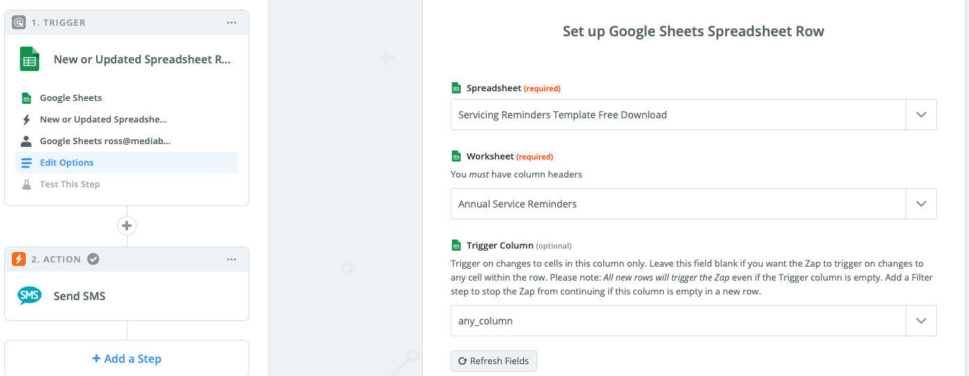 Step 4: In this step we want to select our actual spreadsheet, if you used my free template it will be named “Servicing Reminders Template Free Download” select that as the spreadsheet and then the worksheet will be called “Annual Service Reminders” as for the trigger we want this to be any_column (for advanced users you can select a specific column to only trigger the zap) otherwise read on.
