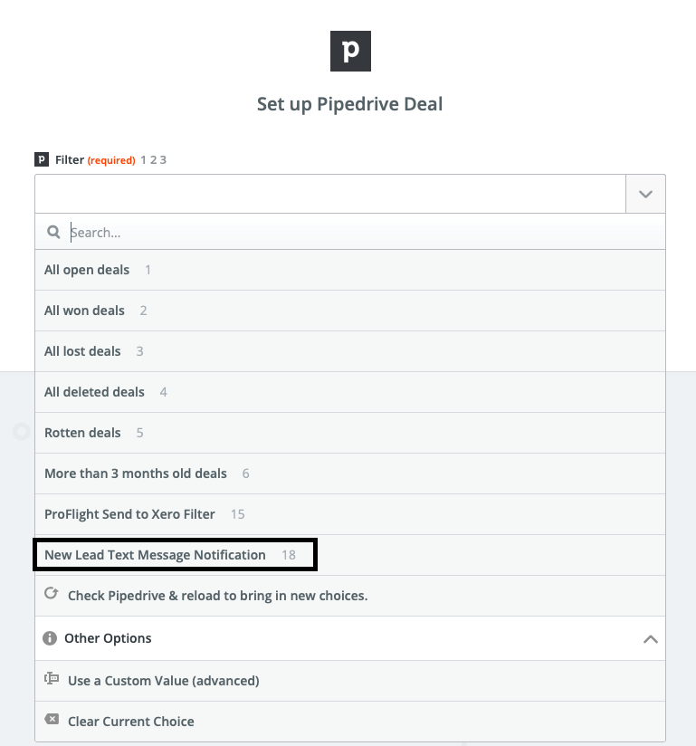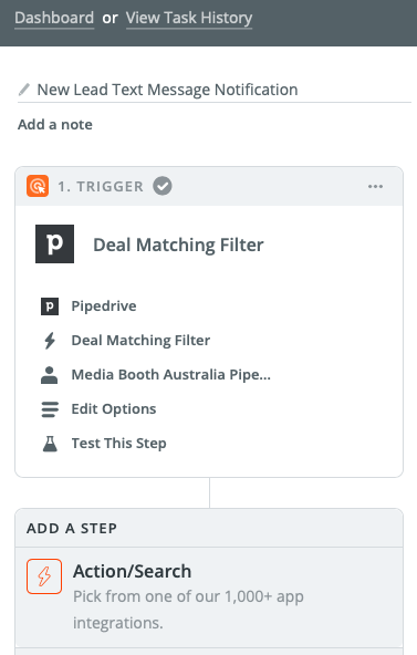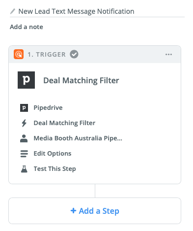 In our below example we going to say that we want to notify our sales team of a new lead arriving in the Lead-In column of PipeDrive. This will trigger an SMS to the sales team advising them of the deal and details.