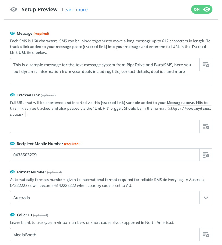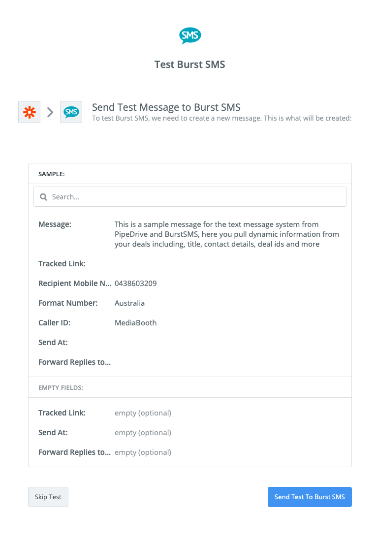 Finally, click the blue next button once you have filled out the above and hit on the Send Test to Burst SMS and check to ensure it is working, then name your Zap (I recommend the same as your filter in PipeDrive for easy reference later on) and turn it on! Your all set.