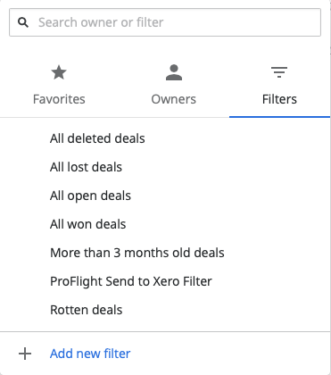 Step 1: Create a custom Filter, to do this simply click your name in the right-hand section just above the pipeline, here you will see Favourites, Owners and Filters. Go ahead and click Add new filter.