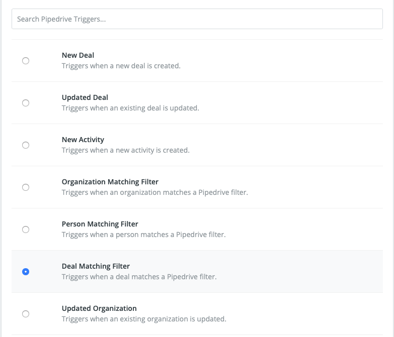 Step 4: Choose a trigger, in the search box type in Pipedrive and click on it. Once the options show like below be sure to. click the blue writing that says “Show Less Common Options” to expand all the options