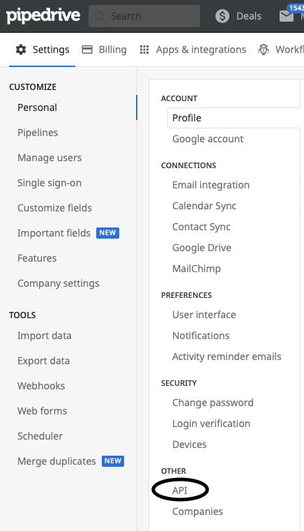 Step 5: Connect your Zapier account to PipeDrive by using the API key located in your PipeDrive Account, to find this go to the PipeDrive dashboard and in the very top right-hand corner click on your name and then click settings and under Other, you will see API. Now head back to Zapier and paste the API key into the popup box and continue.